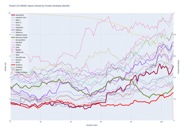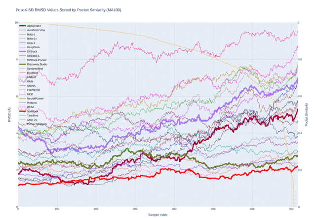 为了进一步分析AI模型的泛化能力,研究中还分析了评测数据与训练数据之间的口袋相似性对于各个模型的影响。无论口袋怎样,基于物理的方法总能保持着比较稳定的预测结果(这是物理方法的独特优势!)。而大部分AI 的方法,如:DiffDock、AlphaFold3 等在全新口袋上表现断崖式下跌。值得注意的是 SurfDock 在AI方法中展现出最好的泛化性,即使是在未知口袋场景中,预测结果也要优于基于物理的对接方法。
