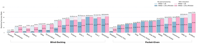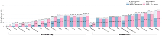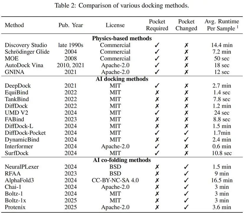 • 物理方法明显落后:最好的GNINA也只有54%左右,与AI顶尖方法差距约20个百分点;