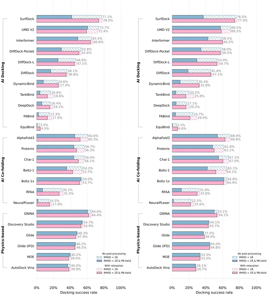 • AI全面领先:Top 9方法中,5个是AI Docking,4个是AI Co-folding;