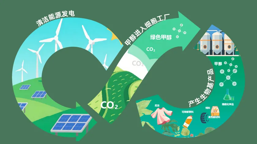 而合成生物技术提供了另一种可能:通过设计改造微生物,将其打造为高效利用甲醇的“细胞工厂”,在温和条件下以极高的选择性将甲醇定向转化为特定目标分子,大幅减少副产物与能耗。更重要的是,这一路径可摆脱对亿万年地质积累的化石能源的依赖,转而利用当期可再生能源(如太阳能、风能等)驱动合成的“绿色甲醇”,以及来自大气存量回收或碳循环闭合的二氧化碳,彻底重构化学制造的物质基础,真正实现制造产业的绿色转型。