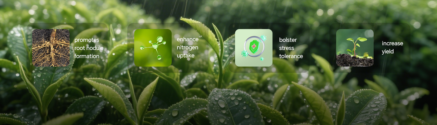 Our applied research demonstrates that these novel nitrogen-fixing agents significantly increase crop root nodule formation rates, enhancing plants' nitrogen absorption capacity, thus reducing fertilizer use and environmental burden. Meanwhile, growth-regulating active molecules markedly boost plant photosynthesis, improving crop resilience and enabling them to better withstand adverse conditions such as drought and pests.